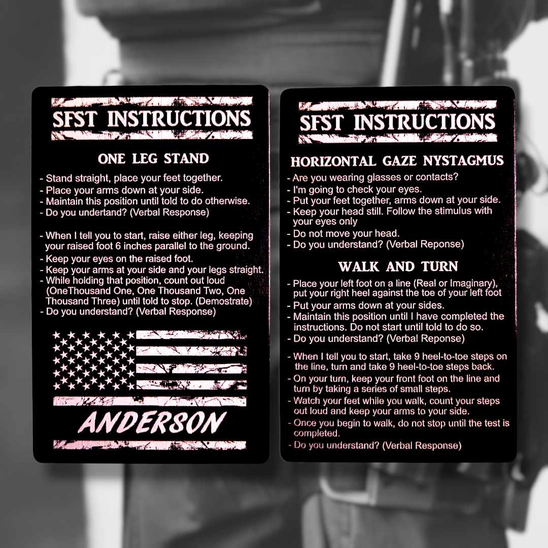 A must have for all law enforcement officers. In the world of law enforcement, SFST cards are a must have. Giving clear instructions when working a DWI, DUI or OWI is one of the most important things you can do. Our cards are made from extra thick metal and fiber laser engraved into the metal to ensure the engraving will be there forever. Fully personalized with your choice of name or other wording.